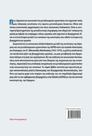 Διερευνώντας τις κοινωνικές αλληλεπιδράσεις μεταξύ της κοινότητας της Λάρυμνας και του μεταλλουργικού εργοστασίου της ΛΑΡΚΟ κατά την περίοδο ιδιοκτησίας και διοίκησης του Πρόδρομου - Μποδοσάκη Αθανασιάδη (1953-1979), η μελέτη αναδεικνύει τον καταλυτικό ρόλο της βιομηχανικής εργασίας ως μιας μεταβλητής που δρομολογεί αλλαγές στη ζωή των εργαζομένων. Με την ανάλυση των κοινωνικών δικτύων, όπως αυτά αποτυπώνονται μέσα από το θεσμό της συγγένειας και της εντοπιότητας, παρουσιάζεται η σταδιακή ενσωμάτωση του μεταλλουργικού εργοστασίου στην κοινωνική ζωή των κατοίκων. Το παρόν βιβλίο αποτελεί μια πρωτότυπη μικρο-κοινωνιολογική μελέτη Οικονομικής και Βιομηχανικής Κοινωνιολογίας, που θέτει για πρώτη φορά στον πυρήνα της ανάλυσής του, τον παράλληλο βηματισμό μιας από τις πιο εμβληματικές βιομηχανίες στην Ελλάδα (ΛΑΡΚΟ) με την πιο κοντινή κοινότητά της, την Λάρυμνα.