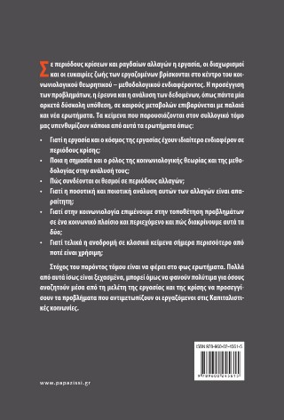 Σε περιόδους κρίσεων και ραγδαίων αλλαγών η εργασία, οι διαχωρισμοί και οι ευκαιρίες ζωής των εργαζομένων βρίσκονται στο κέντρο του κοινωνιολογικού θεωρητικού – μεθοδολογικού ενδιαφέροντος. Η προσέγγιση των προβλημάτων, η έρευνα και η ανάλυση των δεδομένων, όπως πάντα μία αρκετά δύσκολη υπόθεση, σε καιρούς μεταβολών επιβαρύνεται με παλαιά και νέα ερωτήματα. Τα κείμενα που παρουσιάζονται στον συλλογικό τόμο μας υπενθυμίζουν κάποια από αυτά τα ερωτήματα όπως:
