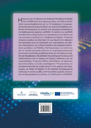 H Έρευνα για την Πράσινη και Ψηφιακή Μετάβαση διεξήχθη από το EKKE κατά τους πρώτους μήνες του 2025 στην Ελλάδα συμπεριλαμβάνοντας και τις 13 περιφέρειες της χώρας. Ως διεπιστημονική έρευνα πεδίου για τη Διττή Μετάβαση συνδέεται λειτουργικά με το σύνολο των επιμέρους διαστάσεων της Εμβληματικής Δράσης JustReDI. Ο σκοπός του JustReDI συνολικά είναι η διερεύνηση των προκλήσεων που θέτουν για την κοινωνία η πράσινη και η ψηφιακή μετάβαση. Η έρευνα στοχεύει ακριβώς να απαντήσει σε ερωτήματα που αφορούν τον σχεδιασμό και την υλοποίηση των ευρωπαϊκών και εθνικών στρατηγικών για τη δίκαιη πράσινη και ψηφιακή αναπτυξιακή μετάβαση της Ελλάδας. Να διερευνήσει τον αντίκτυπο για τις τοπικές κοινωνίες αλλά και τις ευρύτερες κοινωνικές επιπτώσεις της διπλής μετάβασης ιδίως για τις ευάλωτες ομάδες και περιφέρειες. Να εξετάσει την οικονομική και κοινωνική ανθεκτικότητα υπό το πρίσμα της δίκαιης ανάπτυξης και της συμπερίληψης. Η έρευνα πεδίου υλοποιήθηκε με προσωπικές συνεντεύξεις, οι οποίες περιλάμβαναν 170 ερωτήσεις, σε αντιπροσωπευτικό και τυχαίο δείγμα 5.010 ατόμων και νοικοκυριών, με στόχο να παρέχει τη δυνατότητα τεκμηριωμένης ανάλυσης σε γενικές ομάδες, αλλά και ειδικές χωρικές, κοινωνικές και δημογραφικές κατηγορίες του πληθυσμού στην Ελλάδα.