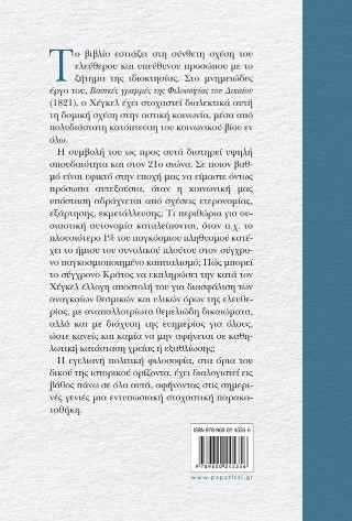 Το βιβλίο εστιάζει στη σύνθετη σχέση του ελεύθερου και υπεύθυνου προσώπου με το ζήτημα της ιδιοκτησίας. Στο μνημειώδες έργο του, Βασικές γραμμές της Φιλοσοφίας του Δικαίου (1821), ο Χέγκελ έχει στοχαστεί διαλεκτικά αυτή τη δομική σχέση στην αστική κοινωνία, μέσα από πολυδιάστατη κατόπτευση του κοινωνικού βίου εν όλω.