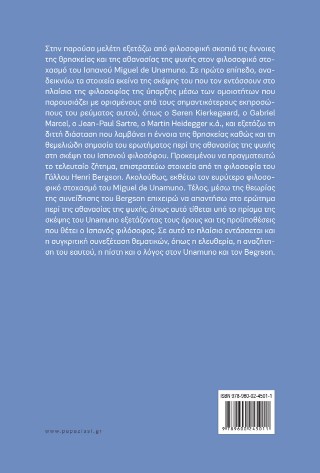 Στην παρούσα μελέτη εξετάζω από φιλοσοφική σκοπιά τις έννοιες της θρησκείας και της αθανασίας της ψυχής στον φιλοσοφικό στοχασμό του Ισπανού Miguel de Unamuno. Σε πρώτο επίπεδο, αναδεικνύω τα στοιχεία εκείνα της σκέψης του που τον εντάσσουν στο πλαίσιο της φιλοσοφίας της ύπαρξης μέσω των ομοιοτήτων που παρουσιάζει με ορισμένους από τους σημαντικότερους εκπροσώπους του ρεύματος αυτού, όπως ο Søren Kierkegaard, ο Gabriel Marcel, o Jean-Paul Sartre, ο Martin Heidegger κ.ά., και εξετάζω τη διττή διάσταση που λαμβάνει η έννοια της θρησκείας καθώς και τη θεμελιώδη σημασία του ερωτήματος περί της αθανασίας της ψυχής στη σκέψη του Ισπανού φιλοσόφου. Προκειμένου να πραγματευτώ το τελευταίο ζήτημα, επιστρατεύω στοιχεία από τη φιλοσοφία του Γάλλου Henri Bergson. Ακολούθως, εκθέτω τον ευρύτερο φιλοσοφικό στοχασμό του Miguel de Unamuno. Τέλος, μέσω της θεωρίας της συνείδησης του Bergson επιχειρώ να απαντήσω στο ερώτημα περί της αθανασίας της ψυχής, όπως αυτό τίθεται υπό το πρίσμα της σκέψης του Unamuno εξετάζοντας τους όρους και τις προϋποθέσεις που θέτει ο Ισπανός φιλόσοφος. Σε αυτό το πλαίσιο εντάσσεται και η συγκριτική συνεξέταση θεματικών, όπως η ελευθερία, η αναζήτηση του εαυτού, η πίστη και ο λόγος στον Unamuno και τον Begrson.