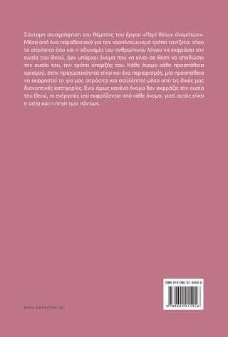 Σύντομη σκιαγράφηση του θέματος του έργου «Περὶ θείων ὀνομάτων». Μέσα από ένα παραδοσιακό για τον νεοπλατωνισμό τρόπο τονίζεται τόσο το απρόσιτο όσο και η αδυναμία του ανθρώπινου λόγου να εκφράσει την ουσία του Θεού. Δεν υπάρχει όνομα που να είναι σε θέση να αποδώσει την ουσία του, τον τρόπο ύπαρξής του. Κάθε όνομα κάθε προσπάθεια ορισμού, στην πραγματικότητα είναι και ένα περιορισμός, μία προσπάθεια να εκφραστεί το για μας απρόσιτο και ασύλληπτο μέσα από τις δικές μας διανοητικές κατηγορίες. Ενώ όμως κανένα όνομα δεν εκφράζει την ουσία του Θεού, οι ενέργειές του εκφράζονται από κάθε όνομα, γιατί αυτός είναι η αιτία και η πηγή των πάντων.
