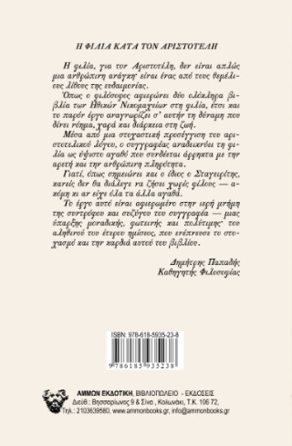 Η φιλία, για τον Αριστοτέλη, δεν είναι απλώς μια ανθρώπινη ανάγκη· είναι ένας από τους θεμέλιους λίθους της ευδαιμονίας. Όπως ο φιλόσοφος αφιερώνει δύο ολόκληρα βιβλία των Ηθικών Νικομαχείων στη φιλία, έτσι και το παρόν έργο αναγνωρίζει σ’ αυτήν τη δύναμη που δίνει νόημα, χαρά και διάρκεια στη ζωή.Μέσα από μια στοχαστική προσέγγιση του αριστοτελικού λόγου, ο συγγραφέας αναδεικνύει τη φιλία ως ύψιστο αγαθό που συνδέεται άρρηκτα με την αρετή και την ανθρώπινη πληρότητα. Γιατί, όπως σημειώνει και ο ίδιος ο Σταγειρίτης, κανείς δεν θα διάλεγε να ζήσει χωρίς φίλους — ακόμη κι αν είχε όλα τα άλλα αγαθά.