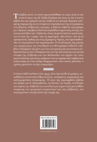 Το βιβλίο αυτό, το οποίο πρωτοεκδόθηκε το 1909, είναι το πιο γνωστό έργο της M. Edith Durham και ίσως το πιο γνωστό βιβλίο που έχει γραφτεί για την Αλβανία γενικότερα. Καρπός πολύμηνης παραμονής και εκτεταμένων περιηγήσεων της συγγραφέως στις βόρειες Αλβανικές περιοχές, η Βόρεια Αλβανία περιγράφει με ενάργεια, ακρίβεια αλλά και συμπάθεια σημαντικές πτυχές του κοινωνικού βίου των Αλβανών, όπως τη φυλετική του οργάνωση, την έννοια της «τιμής» και τις αιματηρές «βεντέτες» που αυτή προκαλούσε, καθώς και τους άγραφους νόμους, που προσπαθούσαν να περιορίσουν την αιματοχυσία. Ο συνδυασμός της ματιάς του περιηγητή με την ευαισθησία του εθνογράφου καθιστά το βιβλίο ενδιαφέρον όχι μόνο για τους ιστορικούς και κοινωνικούς ανθρωπολόγους που ενδιαφέρονται για την πολιτική και κοινωνική ιστορία της Αλβανίας και των Βαλκανίων των αρχών του 20ου αιώνα αλλά και για όσους επιζητούν ένα συναρπαστικό ταξιδιωτικό ανάγνωσμα σε έναν κόσμο διαφορετικό, στον οποίο, μάλιστα, ο χρόνος φαινόταν να είχε σταματήσει.