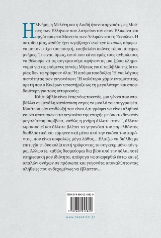 Η Μνήμη, η Μελέτη και η Αοιδή ήταν οι αρχαιότερες Μούσες των Ελλήνων που λατρεύονταν στον Ελικώνα και αργότερα στο Μαντείο των Δελφών και τη Σικυώνα. Η πατρίδα μας, καθώς έχει περιβραχεί από την Ιστορία, σύμφωνα με τον στίχο του ποιητή, κουβαλάει αιώνες τώρα, άπειρες μνήμες. Τι είναι, όμως, αυτό που κάνει εμάς τους ανθρώπους να θέλουμε να τις συγκρατούμε αφήνοντας μια ζώσα κληρονομιά για τις επόμενες γενιές; Μήπως γιατί τα βιβλία της Ιστορίας δεν τα γράφουν όλα; Ή από ματαιοδοξία; Ή για λόγους πιστότητας των γεγονότων; Ή καλύτερα χάριν εντιμότητας, αρετή που ο Κικέρων υποστήριζε ως τη μεγαλύτερη και σπουδαιότερη για τους ιστορικούς;