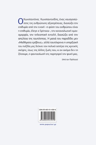 O Κωνσταντίνος Κωνσταντινίδης, ένας ναυαγοσώστης της ανθρώπινης αξιοπρέπειας, διασώζει την επιθυμία από την ενοχή –η φύση του ανθρώπου είναι η επιθυμία, έλεγε ο Spinoza–, την καταναλωτική ομοιομορφία, την τηλεοπτική εντολή, διασώζει από την απώλεια της ταυτότητας. Η ματιά του παραδίδει μεν «Μαθήματα ερέβους», αλλά ταυτόχρονα η υπαρξιακή του πυξίδα μας δείχνει τον πολικό αστέρα της κριτικής σκέψης, ίσως της άλλης ζωής που, κι αν ακόμα δεν τη ζήσουμε, η φαντασίωσή της παρηγορεί την ψυχή μας.