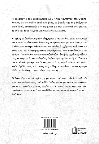Κι όμως οι διαδρομές που οδήγησαν σ’ αυτήν δεν είναι άγνωστες και επαναλαμβάνονται διαρκώς: ανήλικοι που με τον έναν ή τον άλλον τρόπο στρατολογούνται σε οπαδικά σχήματα, πολιτικά, οικονομικά και επιχειρηματικά συμφέροντα που επενδύουν στον τρόμο. Πιο πίσω οικογενειακά αδιέξοδα, βουβές σχολικές αίθουσες, υποκριτικές ευαισθησίες, δήθεν οργισμένοι στίχοι… Όλα είναι εκεί, ολοφάνερα αν θέλεις να τα δεις, το αίμα που ρέει όμως κάθε βράδυ στις γειτονιές της πόλης κρατιέται πάντα κρυφό. Η Θεσσαλονίκη το καταπίνει στη σιωπή της.