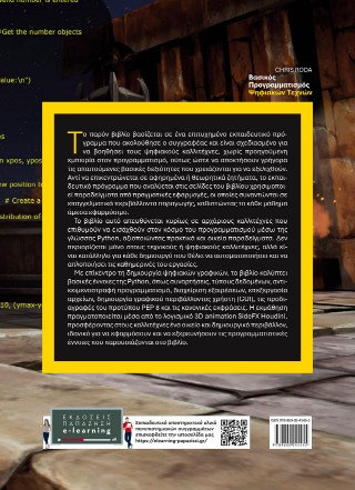 Με επίκεντρο τη δημιουργία ψηφιακών γραφικών, το βιβλίο καλύπτει βασικές έννοιες της Python, όπως συναρτήσεις, τύπους δεδομένων, αντικειμενοστραφή προγραμματισμό, διαχείριση εξαιρέσεων, επεξεργασία αρχείων, δημιουργία γραφικού περιβάλλοντος χρήστη (GUI), τις προδιαγραφές του προτύπου PEP 8 και τις κανονικές εκφράσεις. Η εκμάθηση πραγματοποιείται μέσα από το λογισμικό 3D Animation SideFX Houdini, προσφέροντας στους καλλιτέχνες ένα οικείο και δημιουργικό περιβάλλον, ιδανικό για να εφαρμόσουν και να εξερευνήσουν τις προγραμματιστικές έννοιες που παρουσιάζονται στο βιβλίο.